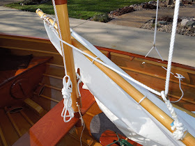 Here is the sail when it is hoisted. Note how the Yard Retaining Line is holding the yard against the mast. You can do this with a simple loop of line around the mast and yard, (a parrel) however when the sail is lowered, I want the sail and yard to fall onto the boom in a more aft position then what a simple parrel will allow. This becomes more apparent when you look at the details in the "Reefing and Topping Lift Lazy Jacks" page. |